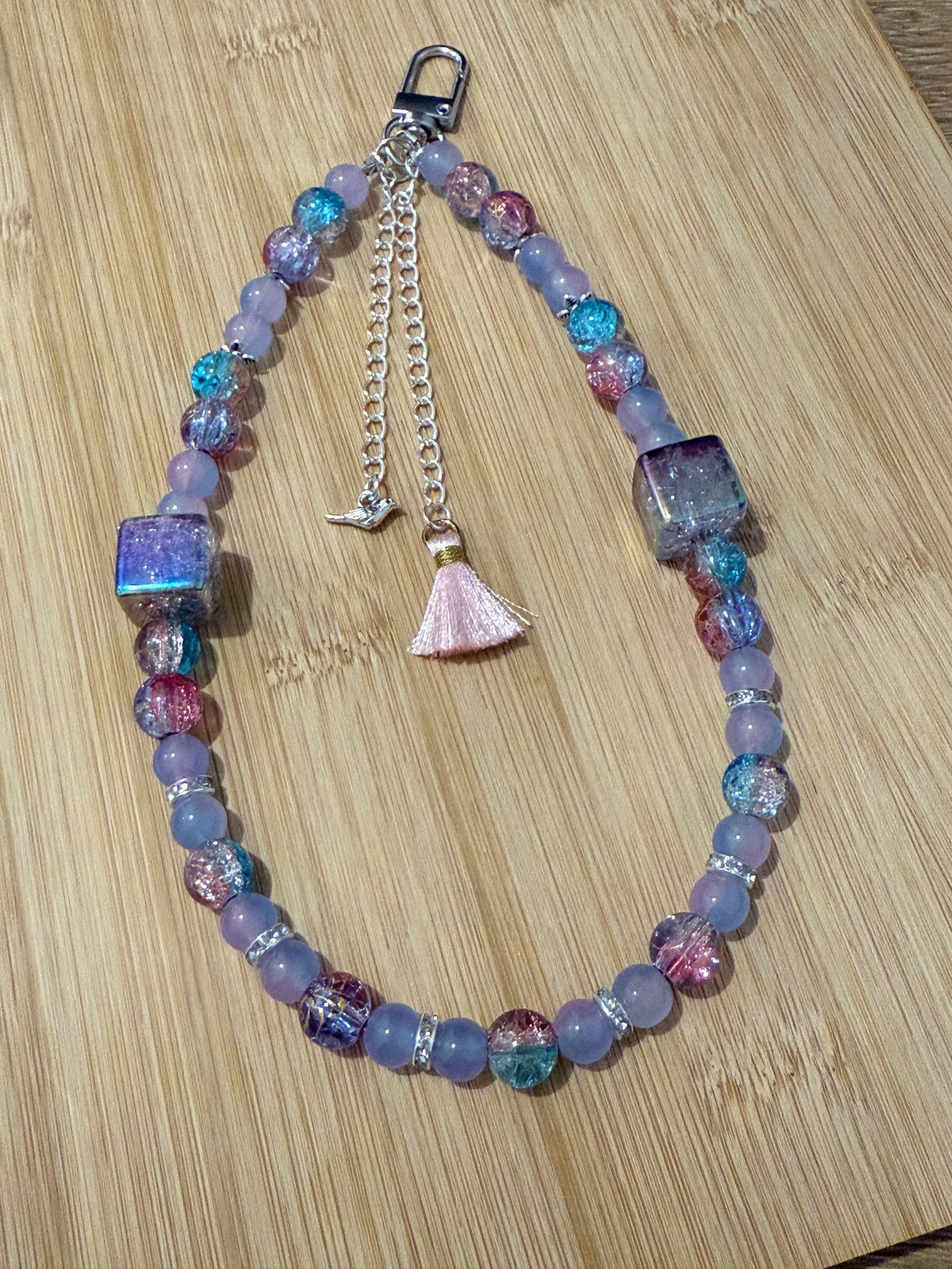 Sublimez votre smartphone avec ce bijou de téléphone unique et tendance. Conçu avec des perles aux reflets violets, bleus et roses, il se distingue par ses perles cubiques scintillantes et son charmant pendentif pampille rose accompagné d’un petit talisman argenté.