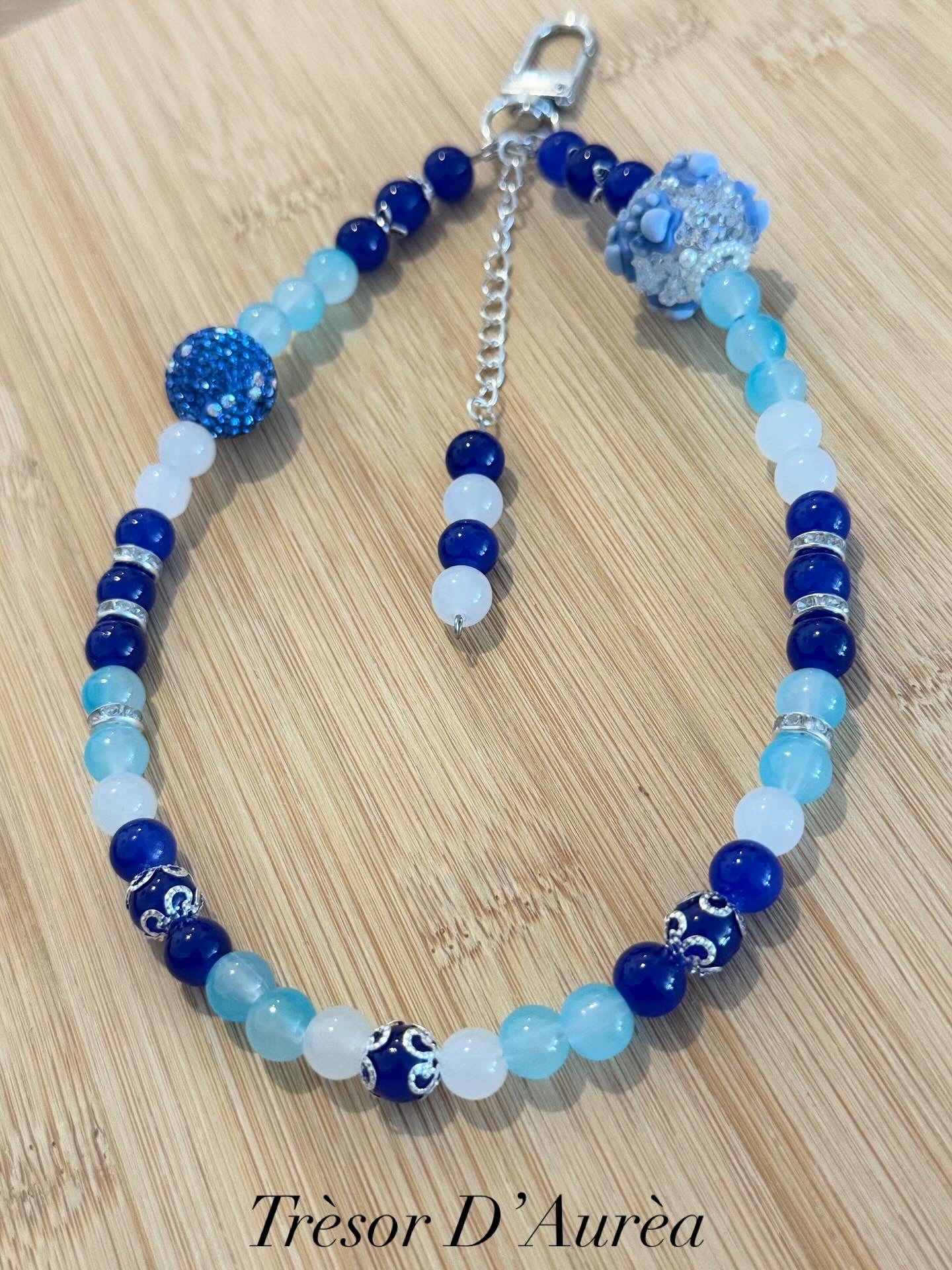 💙 Bijou de téléphone “Nala” – perles bleues et blanches scintillantes 💙