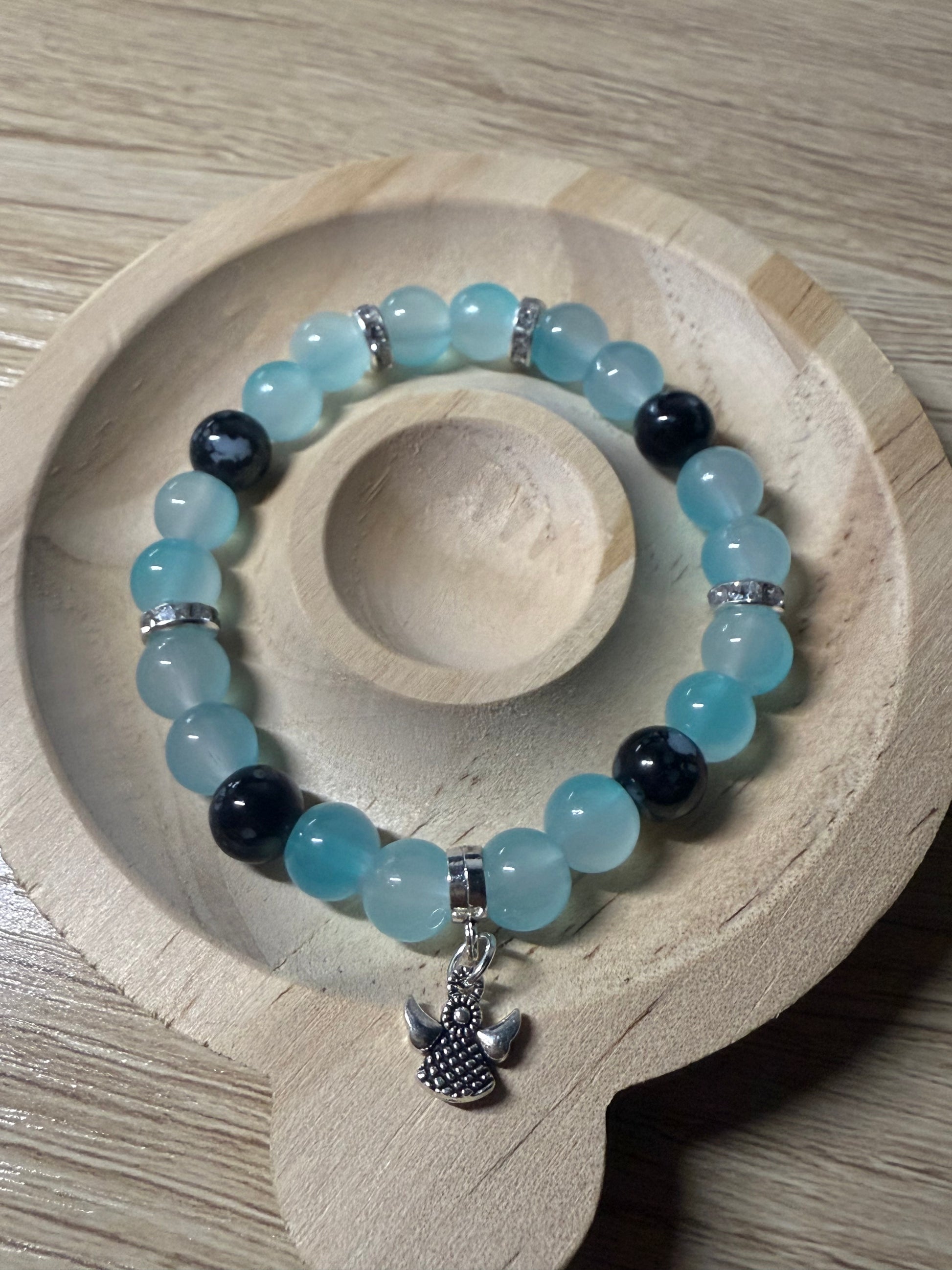 Le bracelet Angélia est un bijou empreint de douceur et de symbolisme. Ses perles bleu clair rappellent la sérénité du ciel, ses perles noires apportent force et équilibre, et son pendentif ange argenté incarne la protection et la bienveillance. Un bijou unique, à la fois élégant et porteur de sens.