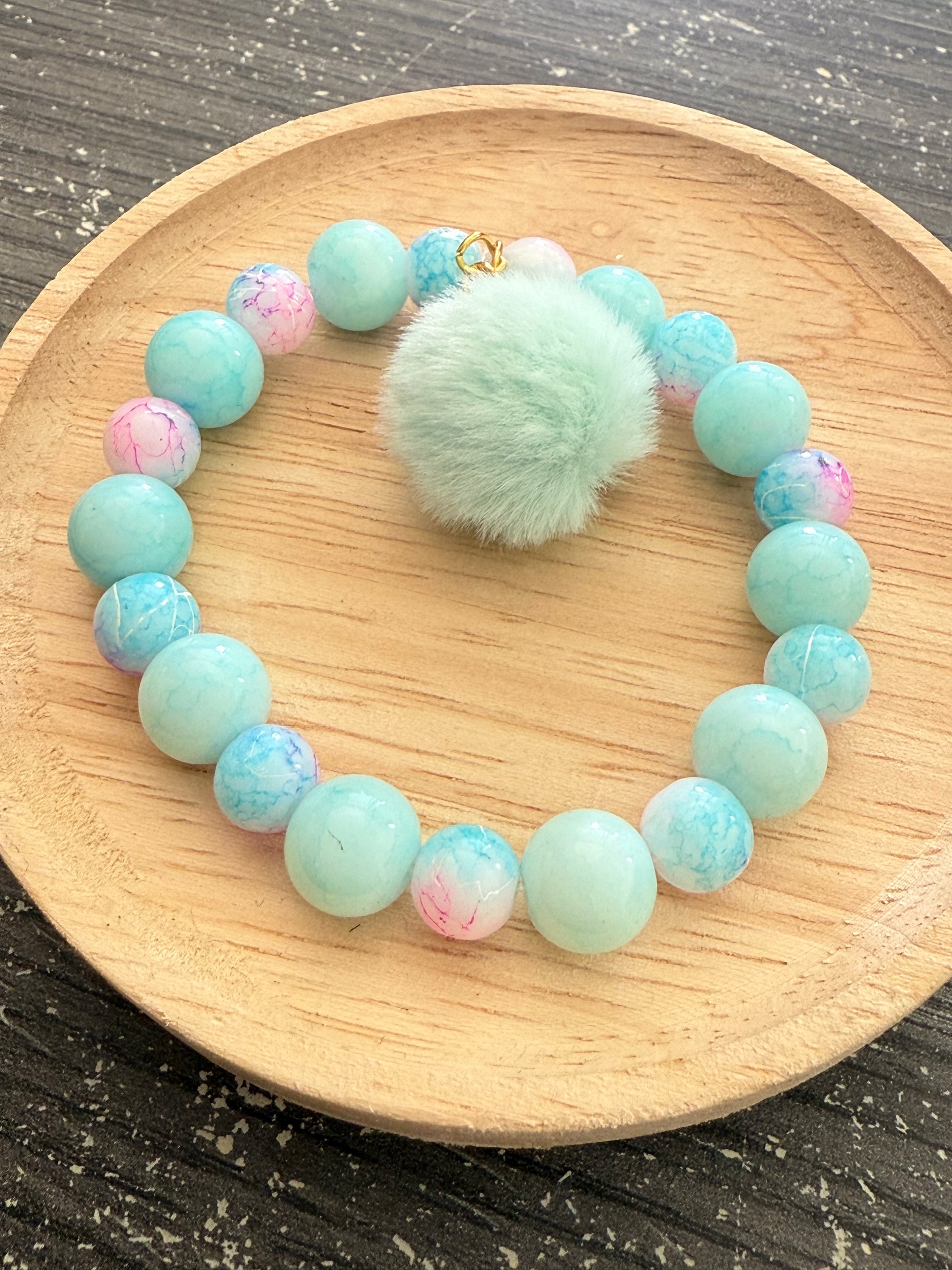 Ce bracelet élastique associe des perles turquoise pâle aux nuances rosées et bleutées pour un effet délicat et apaisant. En son centre, un pompon pastel vert d’eau apporte une touche douce et cocooning. Un bijou plein de fraîcheur, parfait pour illuminer vos tenues avec élégance et légèreté.