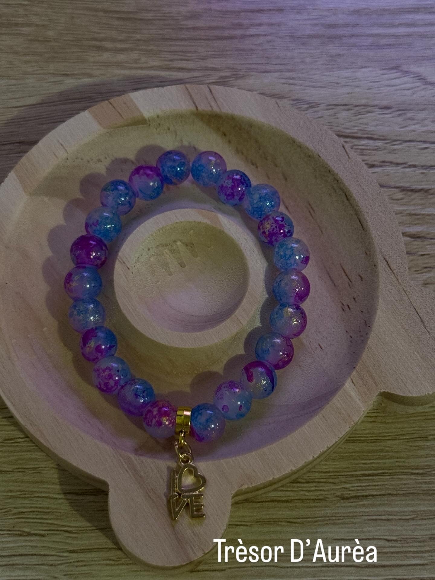 Un bracelet aux couleurs féeriques, composé de perles bleues et roses marbrées aux reflets scintillants. Son pendentif doré “LOVE” apporte une touche romantique et délicate, parfaite pour symboliser douceur et tendresse. Un bijou unique qui saura illuminer vos tenues.