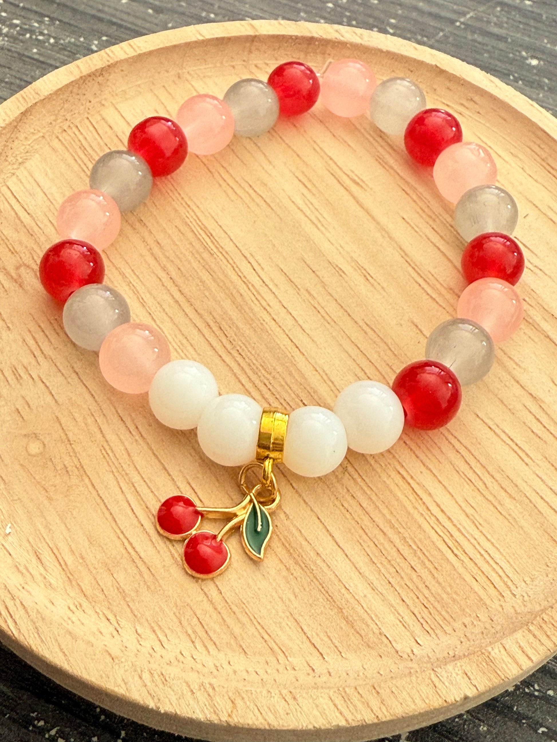 Ce bracelet élastique plein de fraîcheur associe des perles blanches satinées, roses douces, grises translucides et rouges vives. En son centre, un pendentif doré orné d’une petite paire de cerises rouges émaillées apporte une touche gourmande et joyeuse. Un bijou tendance, idéal pour égayer vos tenues avec une note fruitée et fun.