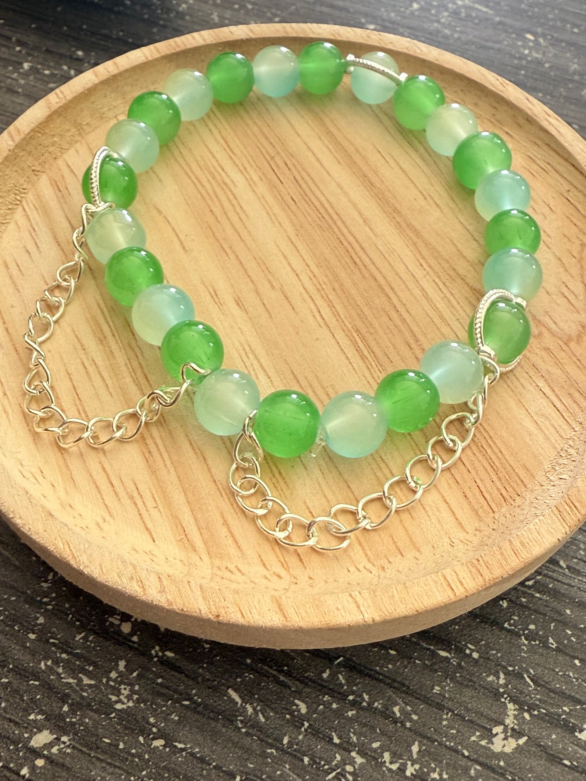 Ce bracelet élastique associe des perles vert jade et vert d’eau translucides, apportant fraîcheur et luminosité. Il est sublimé par une chaîne argentée délicate, qui lui donne une touche moderne et tendance. Un bijou raffiné qui allie élégance et originalité, idéal pour accessoiriser vos tenues avec subtilité.