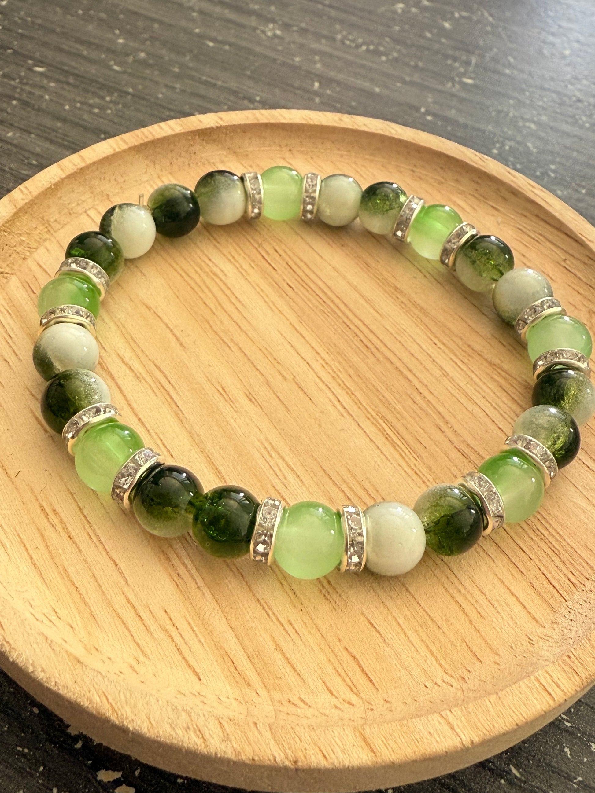 Le bracelet Émera séduit par ses perles vertes lumineuses, associées à de délicats intercalaires argentés ornés de strass. Symbole d’équilibre et de renouveau, il apporte une touche chic et naturelle à votre style, que ce soit au quotidien ou pour une occasion spéciale