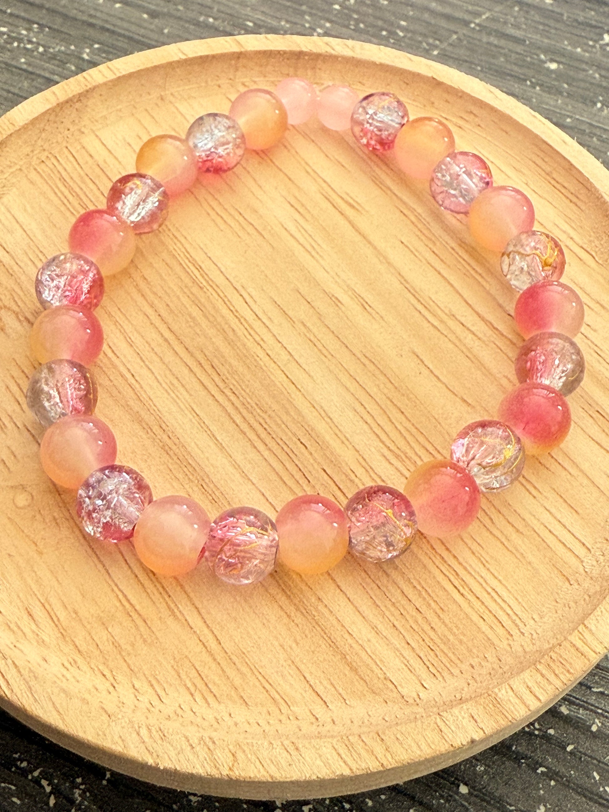 Ce bracelet élastique associe des perles roses tendres et orangées nacrées à des perles craquelées translucides aux reflets scintillants. Léger et lumineux, il incarne la délicatesse et la féminité, parfait pour ajouter une touche de douceur à vos tenues.
