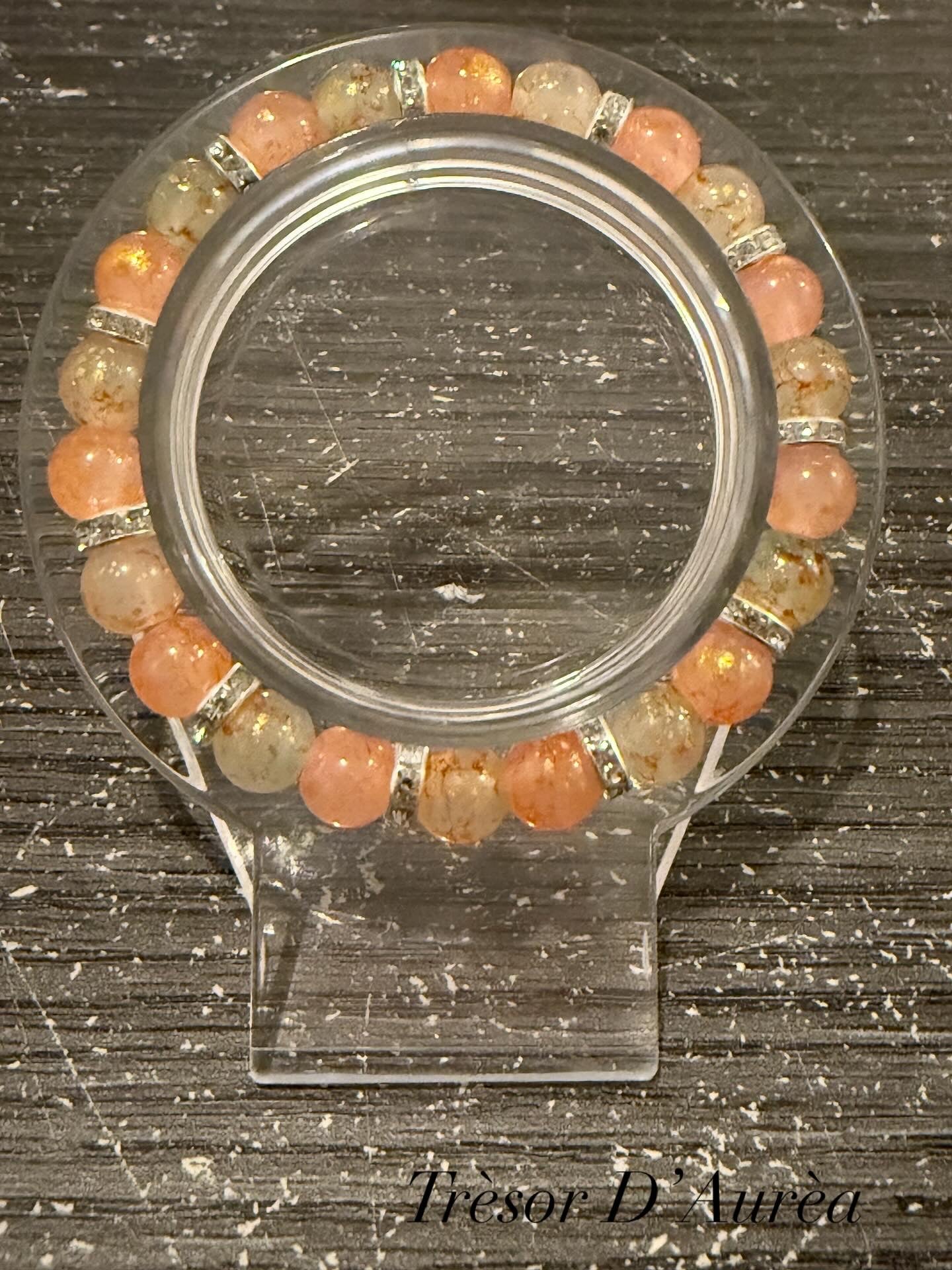 Ce bracelet élastique associe de délicates perles aux tons pêche rosé et doré translucide, rehaussées par des intercalaires argentés étincelants. Raffiné et lumineux, il capte la lumière avec élégance et apporte une touche chaleureuse et féminine à toutes vos tenues.