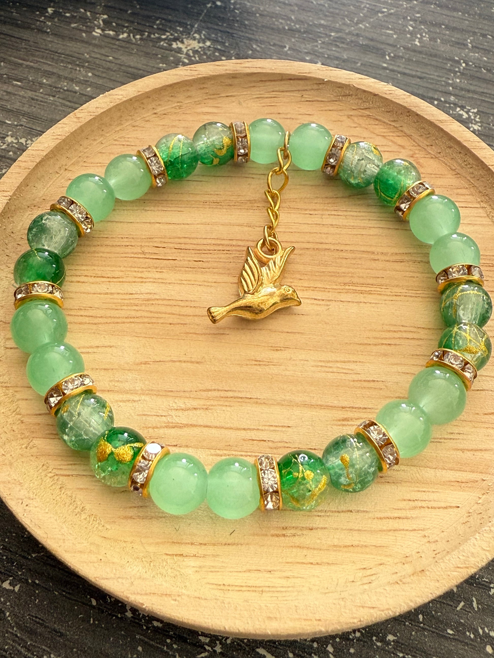 🌿 Bracelet “Élysia” – perles vertes & pendentif oiseau doré 🌿
