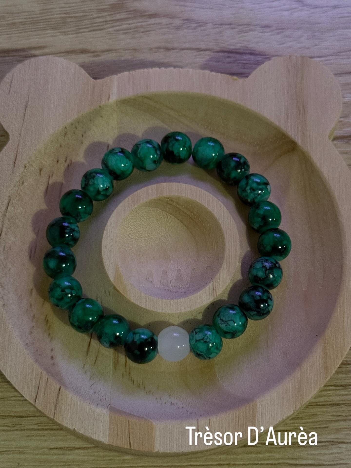 Ce bracelet raffiné est composé de perles vert émeraude aux nuances marbrées, mises en valeur par une perle blanche centrale qui apporte contraste et équilibre. Élégant et intemporel, il est idéal pour ajouter une touche de nature et d’harmonie à vos tenues.