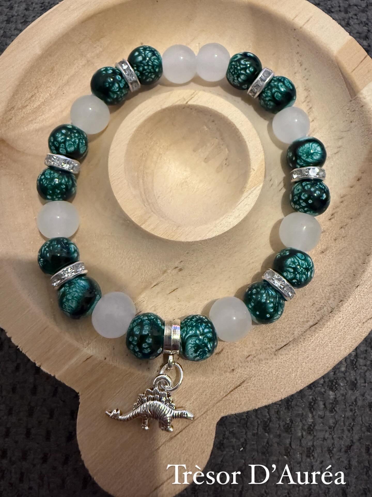 🦖✨ Bracelet perles vertes et blanches avec pendentif dinosaure ✨