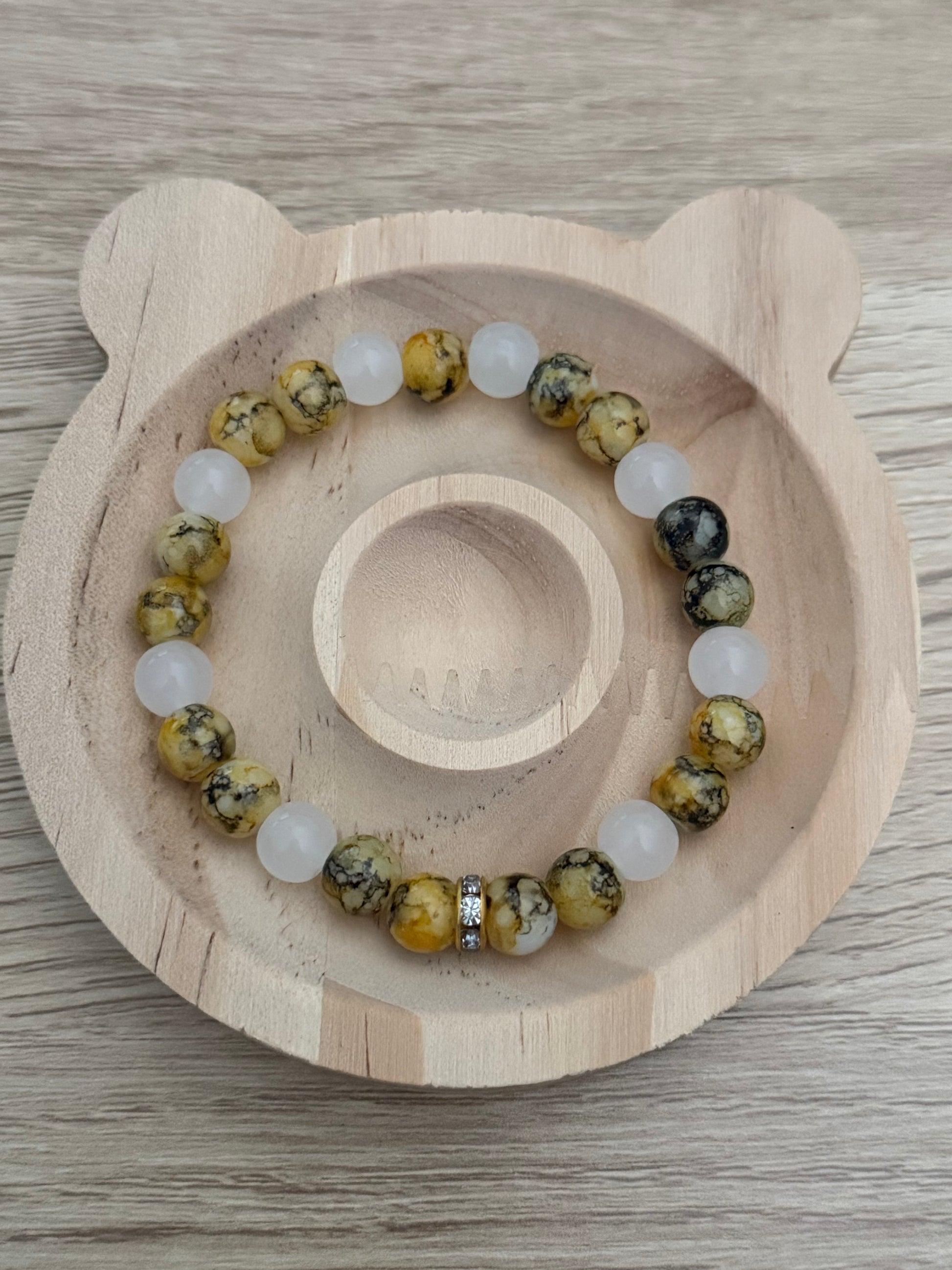 Ce bracelet associe des perles marbrées jaunes et noires à des perles blanches mates, créant un contraste lumineux et raffiné. Son intercalaire orné de strass apporte une touche d’élégance, idéale pour un style à la fois moderne et affirmé.