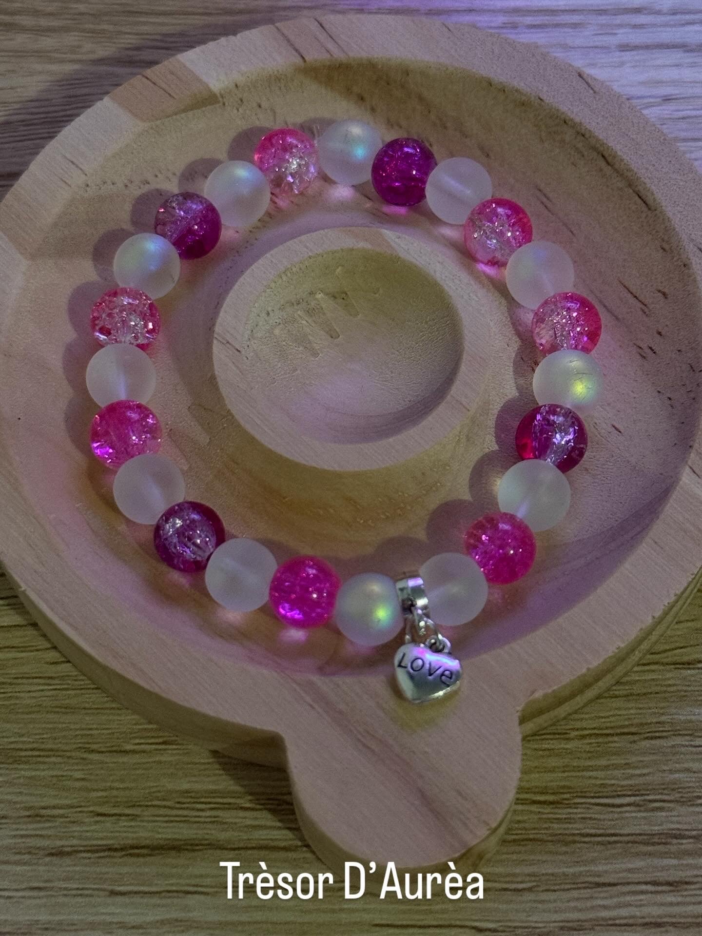 Ce bracelet associe l’éclat des perles roses et blanches aux reflets délicats avec un pendentif en forme de cœur gravé “Love”. Symbole de tendresse et de douceur, il est idéal pour offrir ou pour se faire plaisir. Un bijou lumineux qui apporte une touche romantique à toutes vos tenues.