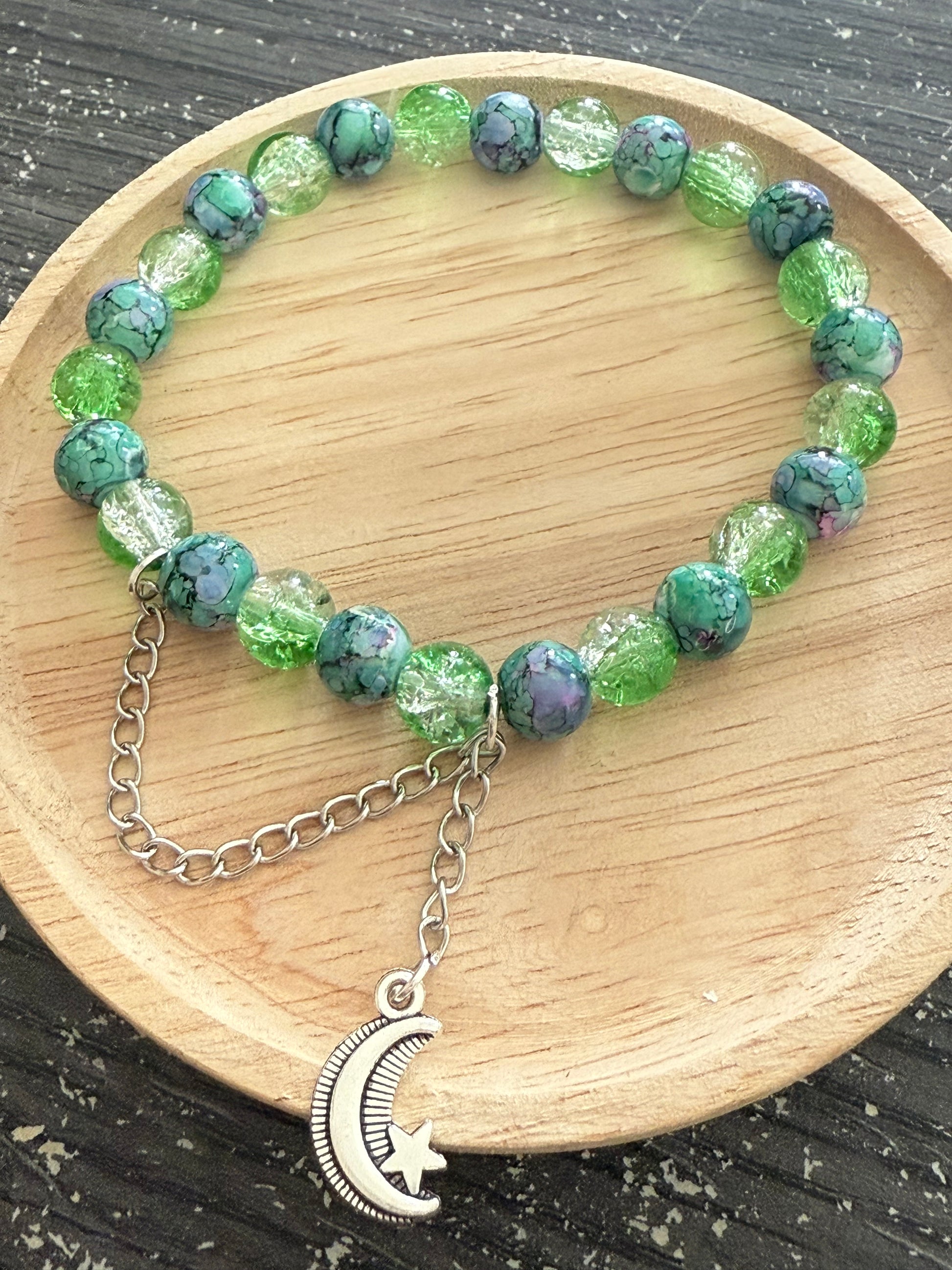 Le bracelet Lunara associe des perles vertes éclatantes et marbrées turquoise, créant un mélange vibrant et élégant. Son pendentif lune et étoile argenté symbolise le rêve et la sérénité, apportant une touche mystique et poétique à ce bijou unique.