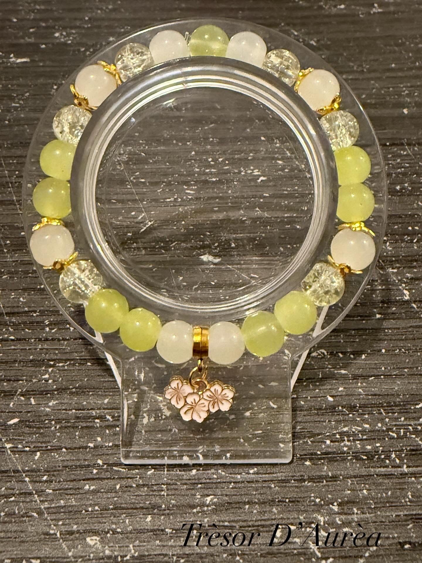 ✨ Bracelet perles jaune et blanches avec pendentif fleurs dorées ✨