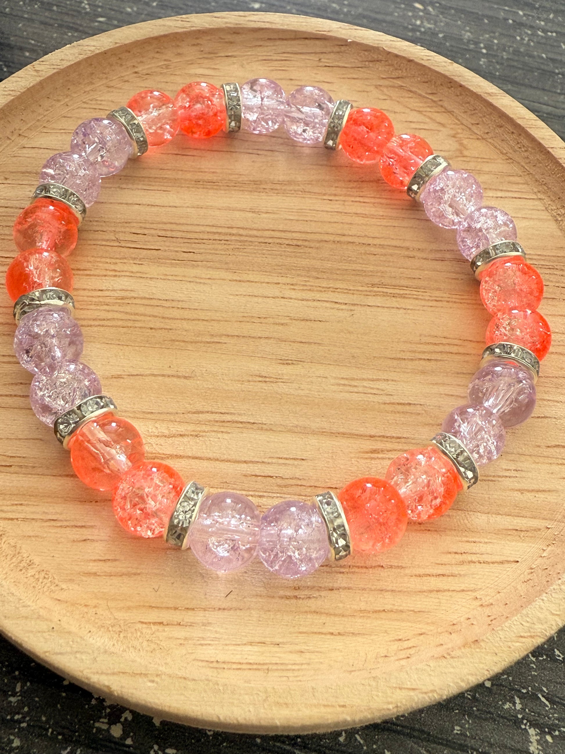 Ce bracelet élastique associe des perles violet pastel et corail éclatant, aux reflets craquelés scintillants. Des intercalaires argentés viennent souligner la brillance et apporter une touche raffinée. Un bijou coloré et pétillant, idéal pour apporter de la gaieté et de l’élégance à vos tenues.