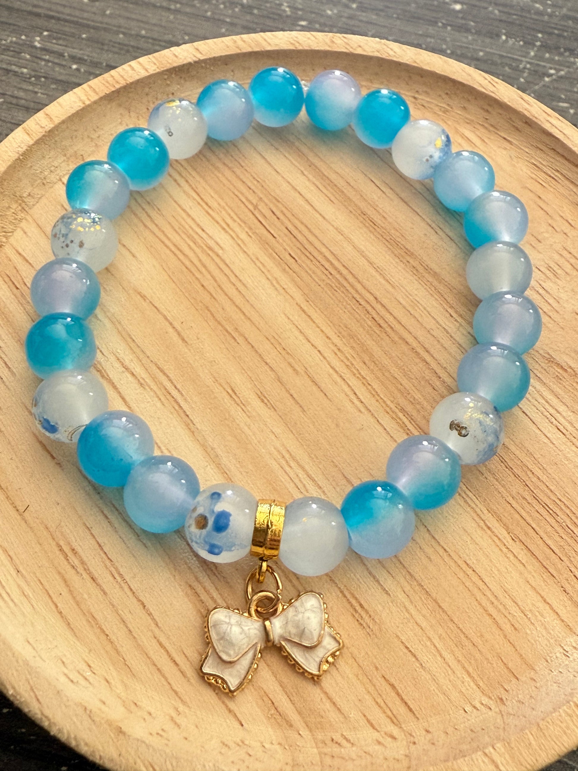 Ce bracelet élastique est composé de perles bleues et blanches aux reflets doux et lumineux, qui rappellent la pureté du ciel et de l’océan. En son centre, un charm nœud blanc doré vient ajouter une touche élégante et féminine, symbole de délicatesse et de raffinement.