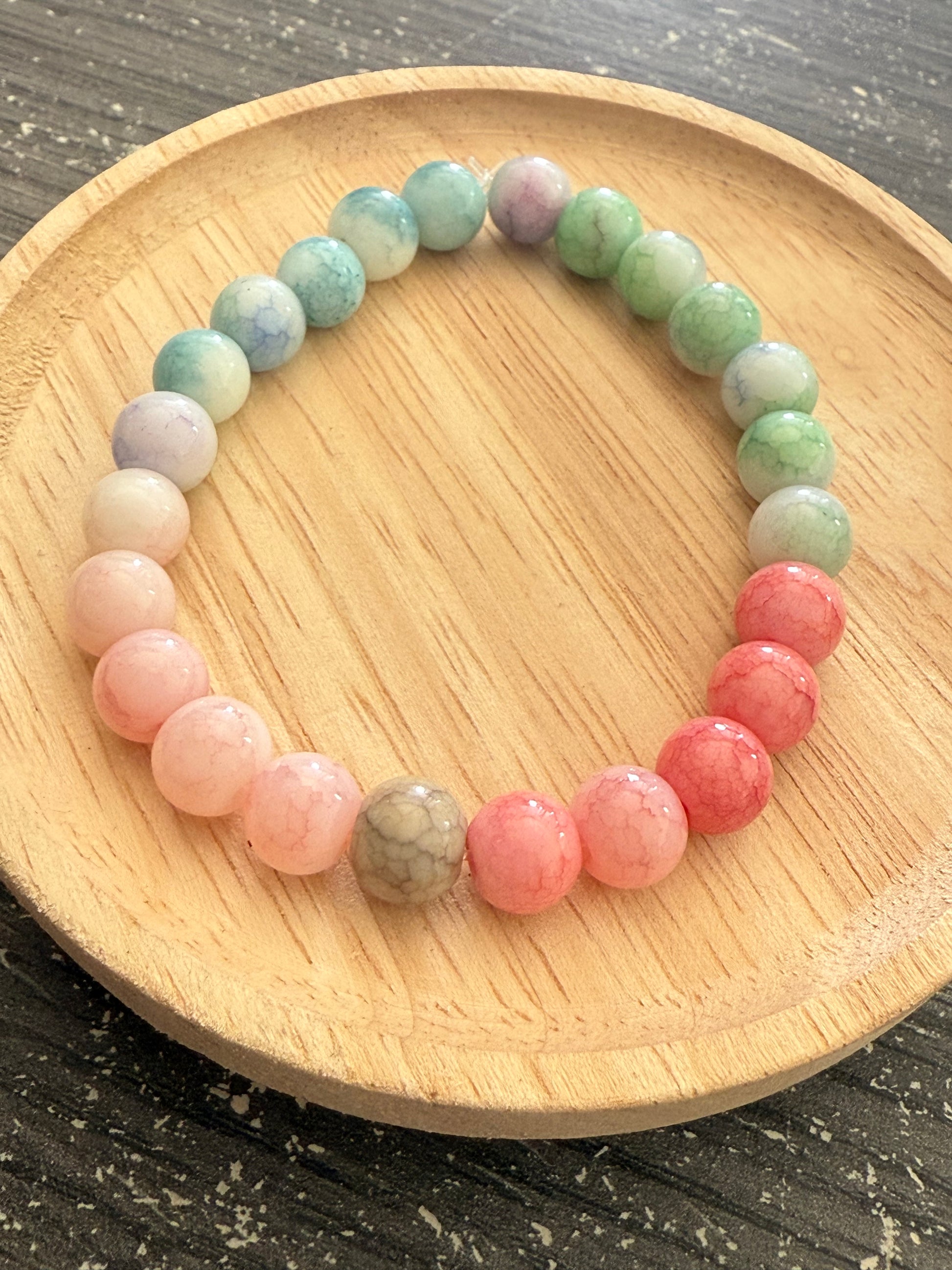 Ce bracelet élastique se distingue par ses perles aux nuances dégradées de rose, vert, bleu et violet, créant un effet frais et délicat. Chaque perle marbrée est unique, ce qui rend ce bijou encore plus spécial. Léger et lumineux, il s’accorde facilement à toutes vos tenues et apporte une touche joyeuse et poétique.