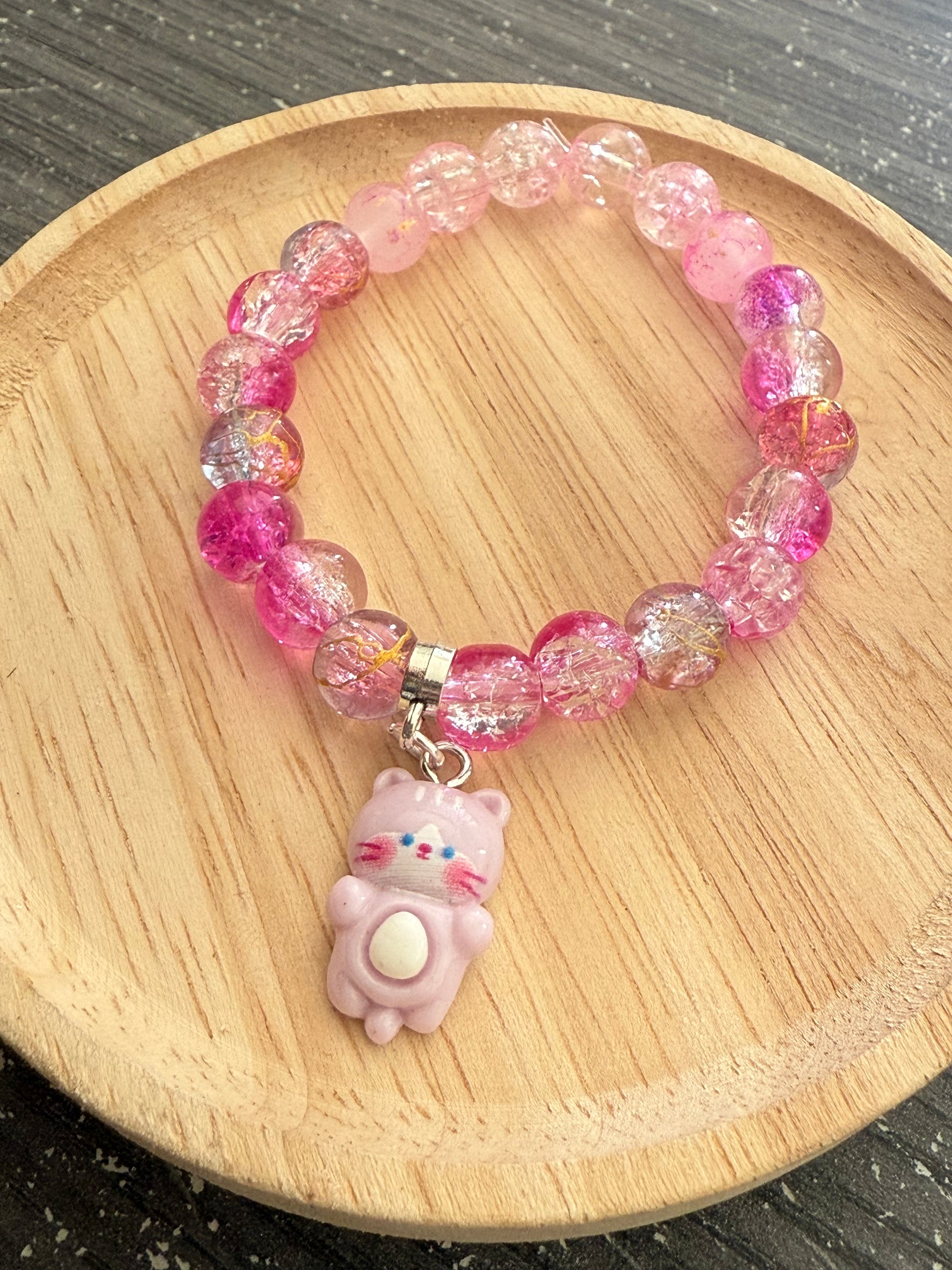 Un bracelet élastique composé de perles roses craquelées scintillantes, reflétant la douceur et la tendresse. En son centre, un adorable pendentif chaton rose, aux joues rougies et au style kawaii, apporte une note ludique et enfantine.