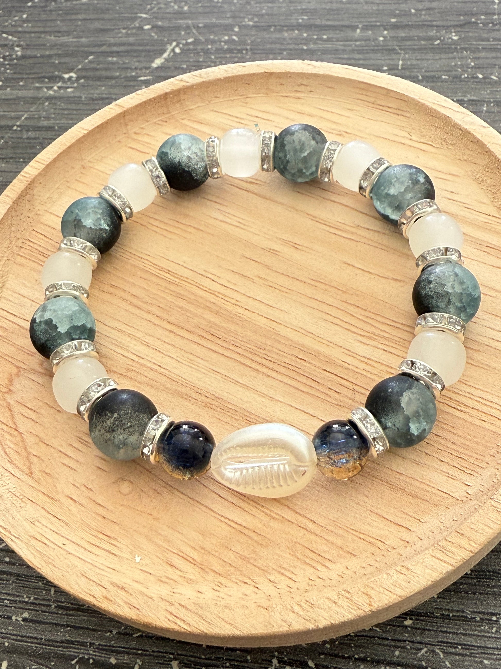 Le bracelet Nolan associe l’élégance des perles bleu profond et blanc nacré à la délicatesse d’un cauri central, symbole de voyage et de protection. Son style marin et raffiné en fait un bijou intemporel, idéal pour ceux qui aiment la mer et la liberté.