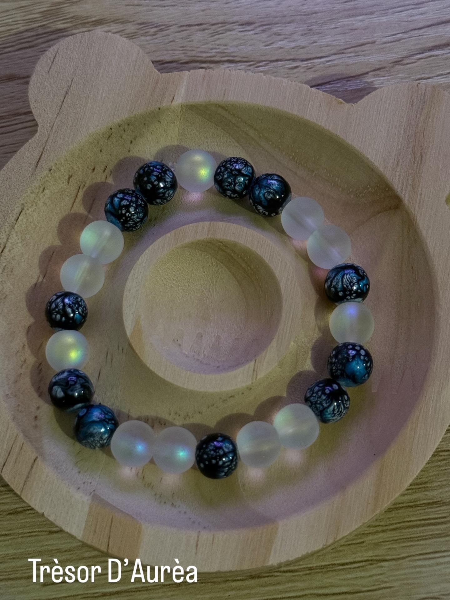 Un bijou mystérieux et raffiné, composé de perles noires aux motifs argentés et de perles blanches translucides aux reflets lumineux. Ce bracelet incarne l’équilibre entre la lumière et l’obscurité, apportant une touche élégante et intemporelle à votre style.