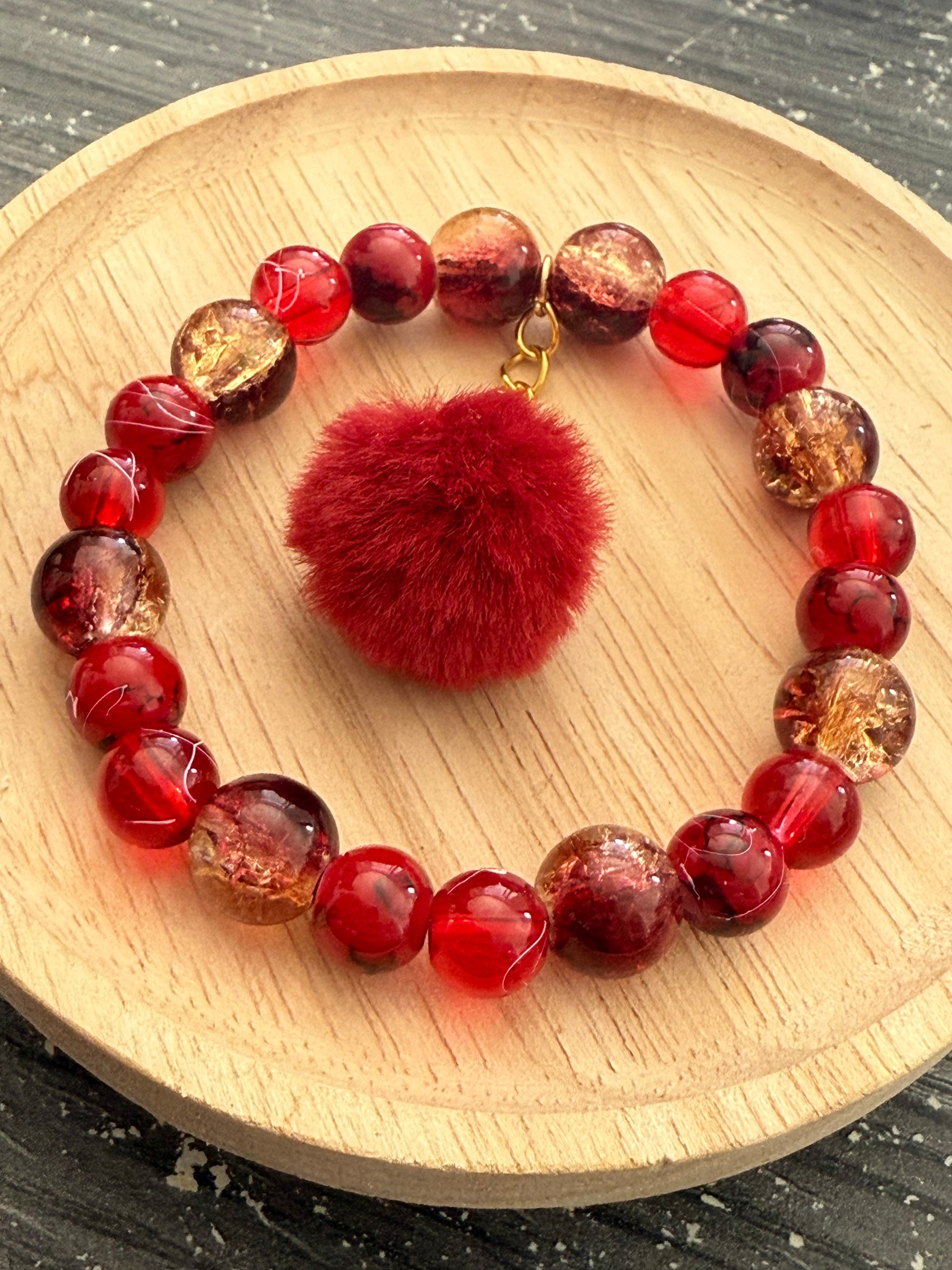 Ce bracelet élastique séduit par ses perles rouges intenses et ambrées craquelées, qui captent la lumière avec éclat. En son centre, un pompon rouge doux et volumineux apporte une touche tendance et chaleureuse. Idéal pour un look audacieux et moderne, ce bijou allie élégance et originalité.