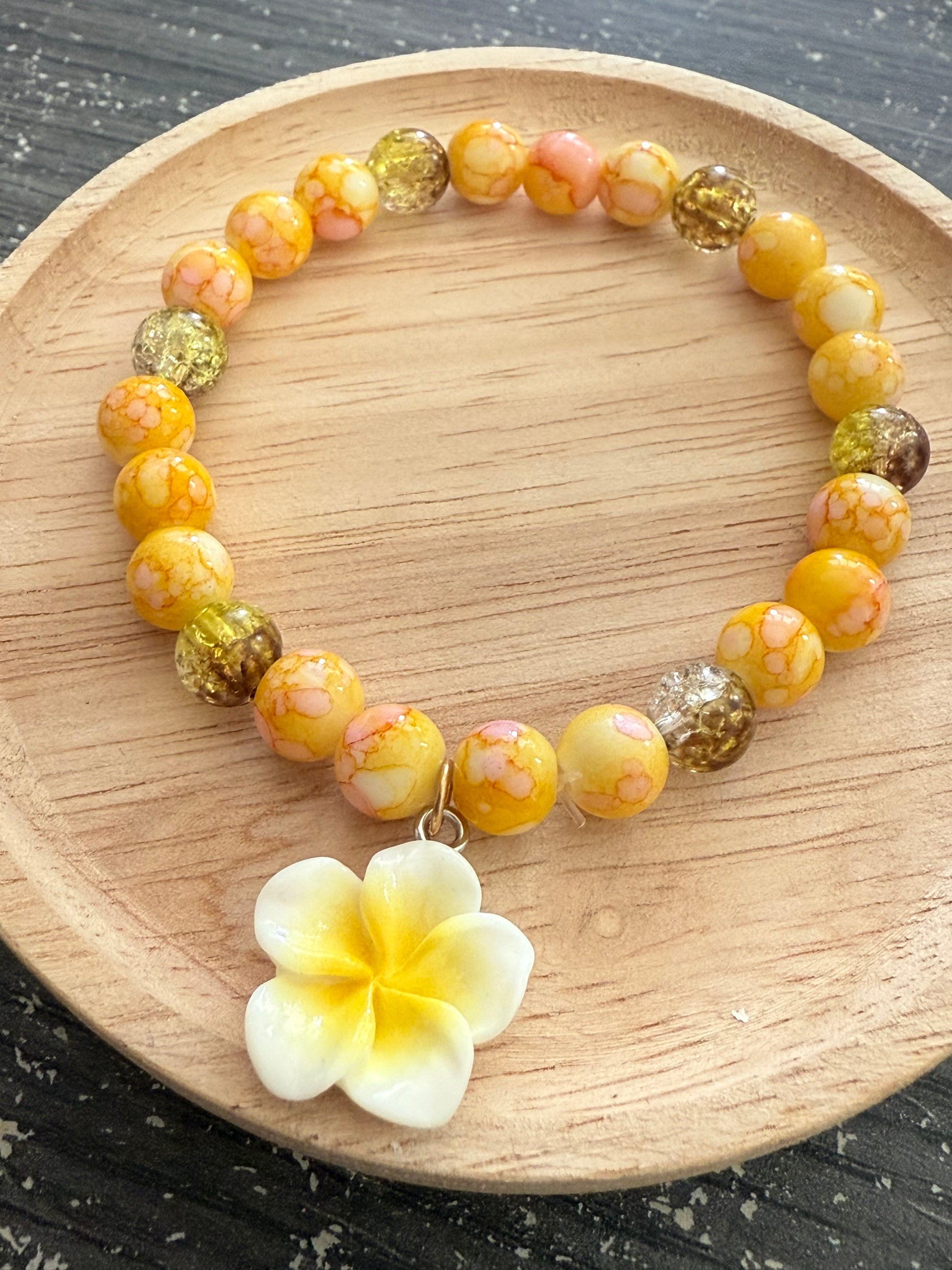Le bracelet Soline rayonne avec ses perles aux tons jaunes et dorés, sublimées par un pendentif fleur blanche et jaune qui évoque le soleil et la douceur estivale. Un bijou lumineux, idéal pour apporter une touche de chaleur et de bonne humeur à ton style.