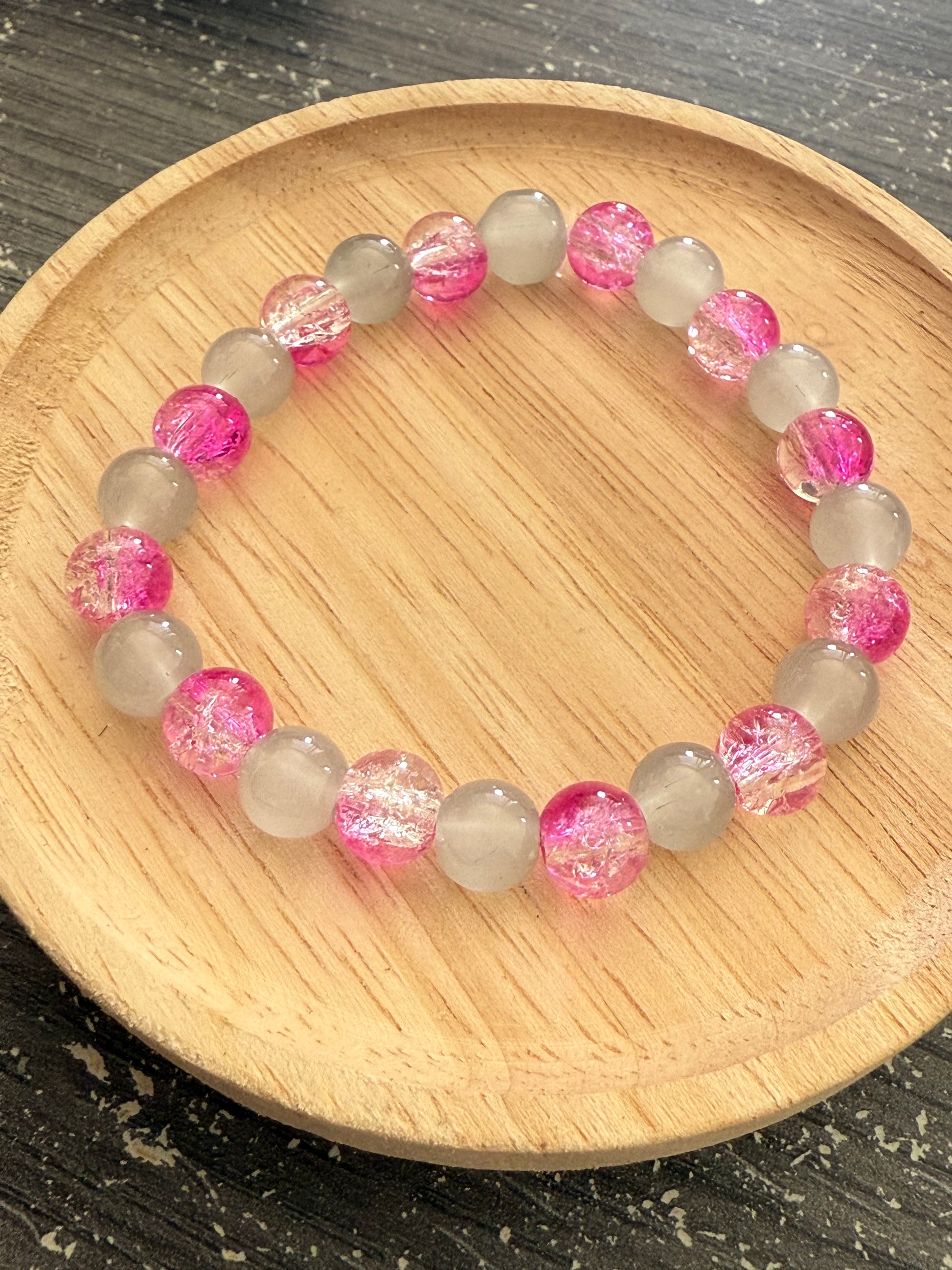Ce bracelet élastique allie des perles roses craquelées lumineuses à des perles grises satinées, créant un équilibre raffiné entre éclat et douceur. Son style élégant et moderne en fait un accessoire parfait pour ajouter une touche de féminité et de subtilité à toutes vos tenues.