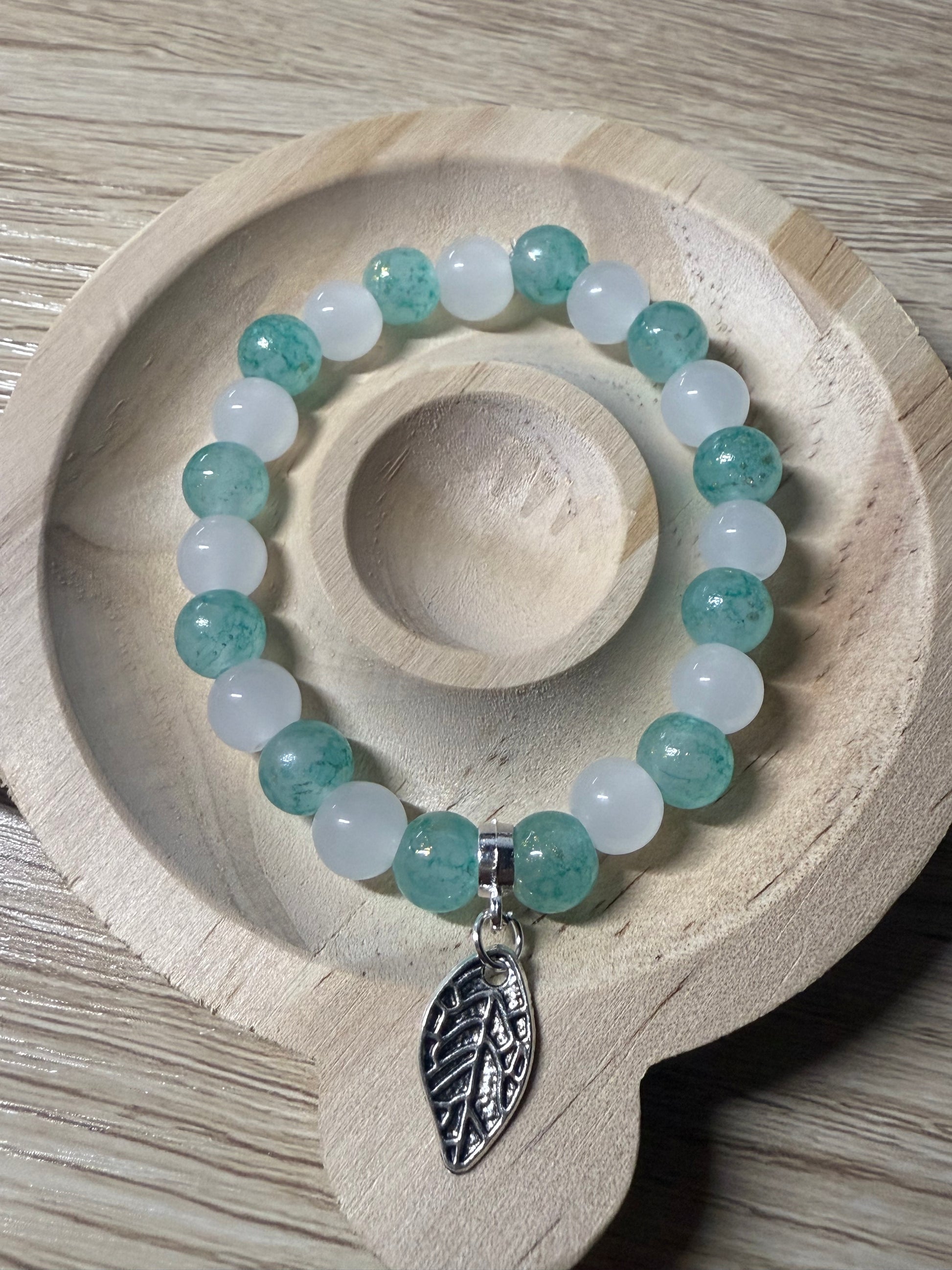 Le bracelet Tatiana séduit par son élégance naturelle. Ses perles vert d’eau et blanches diffusent une aura apaisante, sublimée par un pendentif feuille argentée, symbole de nature et de renouveau. Un bijou frais et raffiné, idéal au quotidien.
