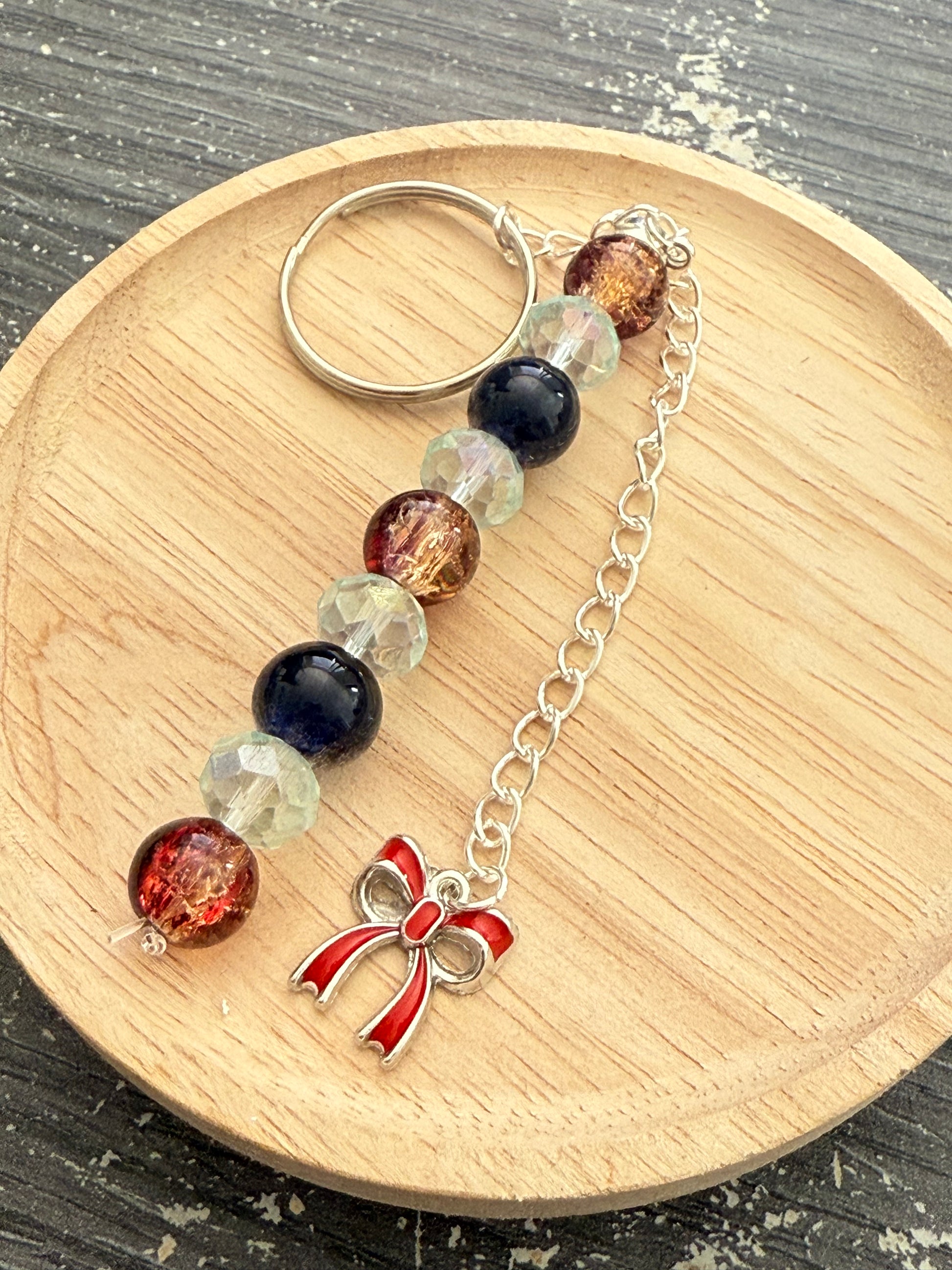 Ce porte-clés élégant est composé de perles brunes craquelées aux reflets dorés, de perles facettées translucides et de perles noires profondes, créant un bel équilibre entre sobriété et éclat. Son pendentif nœud rouge émaillé lui apporte une touche chic et féminine. Un accessoire à la fois pratique et raffiné, idéal pour personnaliser vos clés ou votre sac.